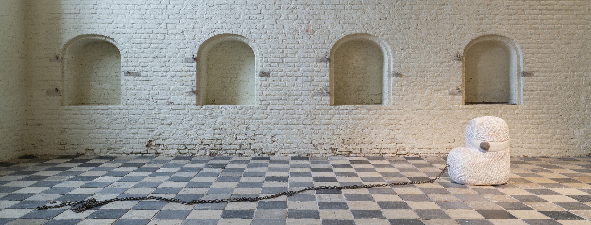 June Crespo’s sculptures make use of the wall and ceiling as much as the floor. They jut, protrude, hang, and, at one point in “their weft, the grass” (2024), her recent show at 1646 Experimental Art Space in The Hague, they penetrate.